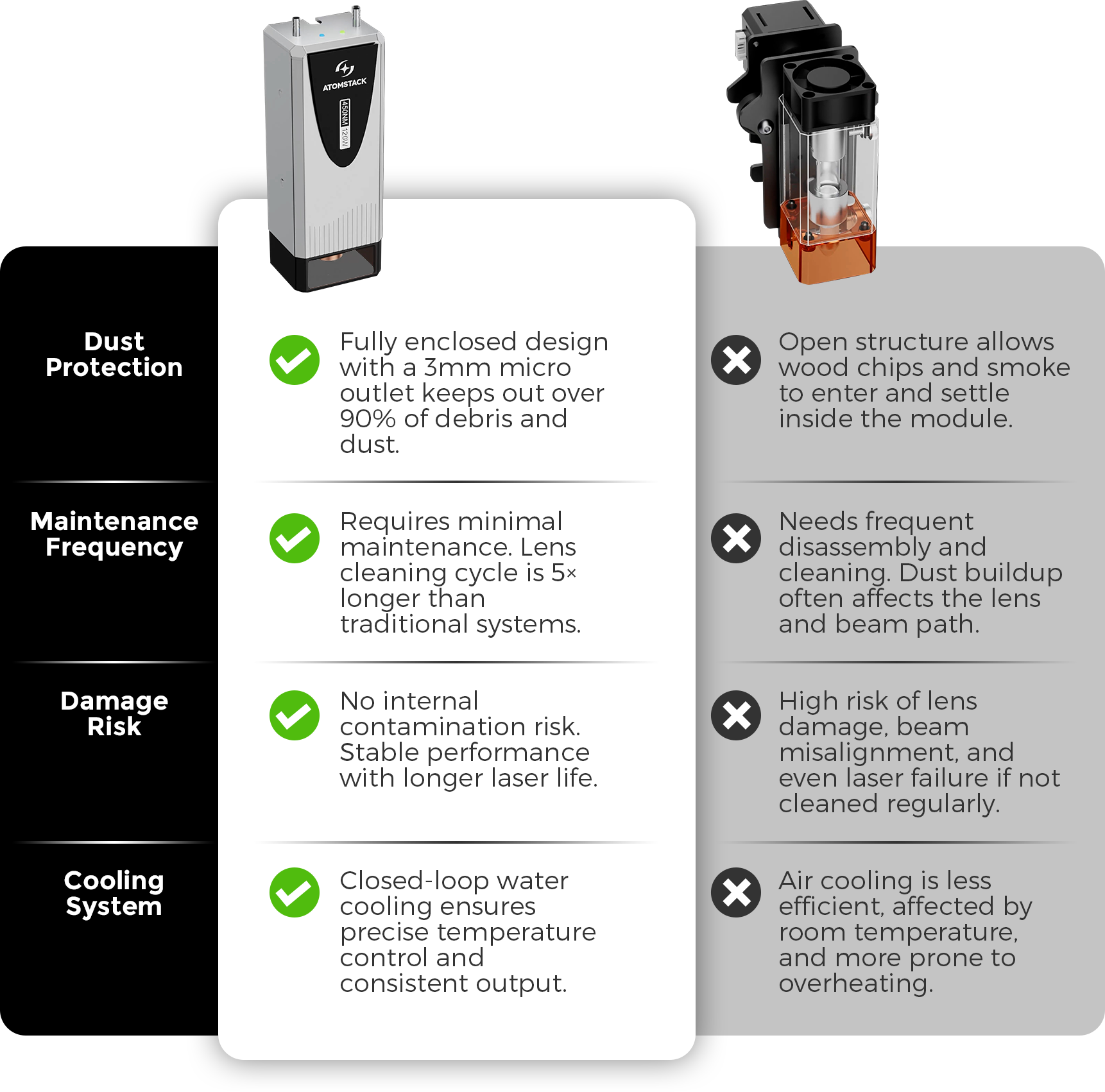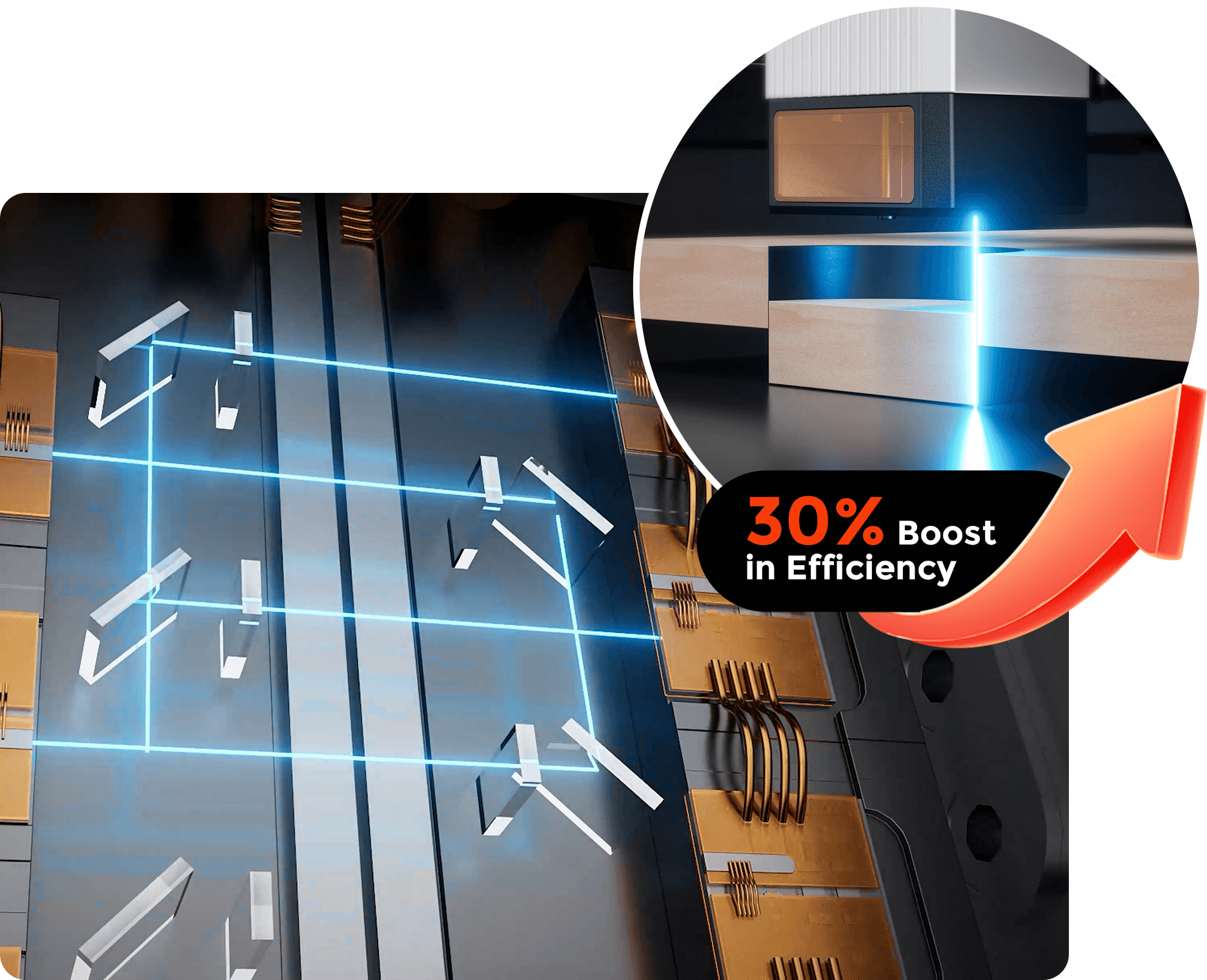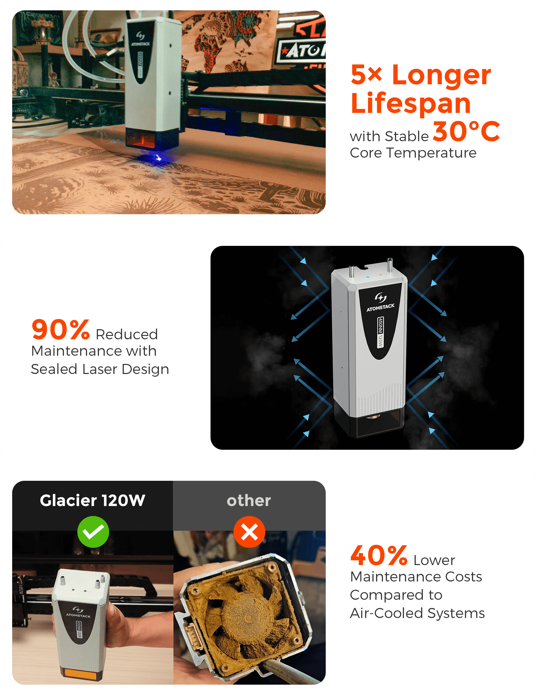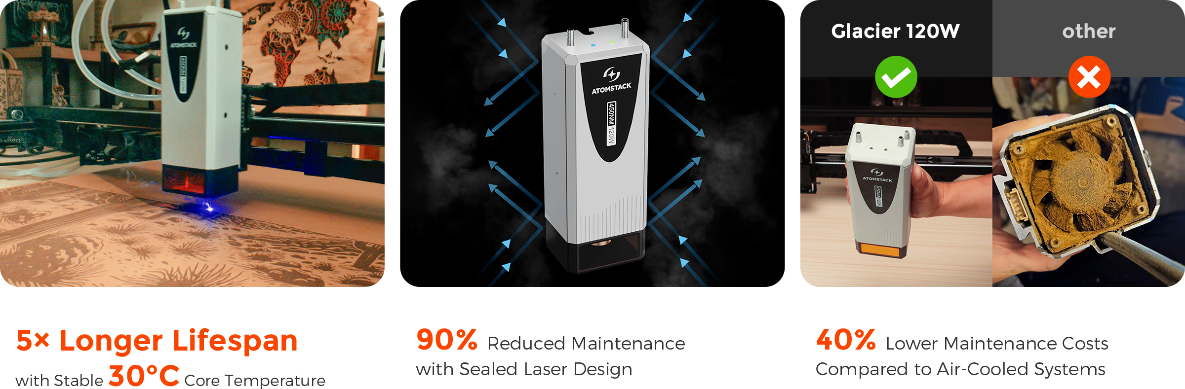 Designed for demanding workflows, our advanced water-cooling system holds the laser at a steady 30°C—enabling true 24/7 operation with zero thermal slowdown. Unlike air cooling, it eliminates overheating issues to keep performance steady from start to finish.